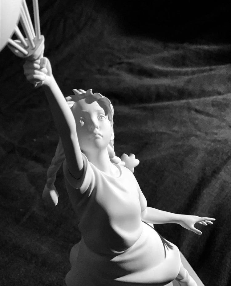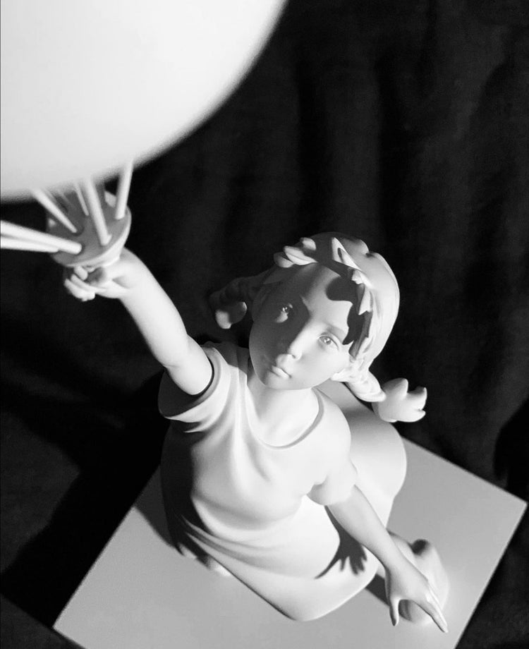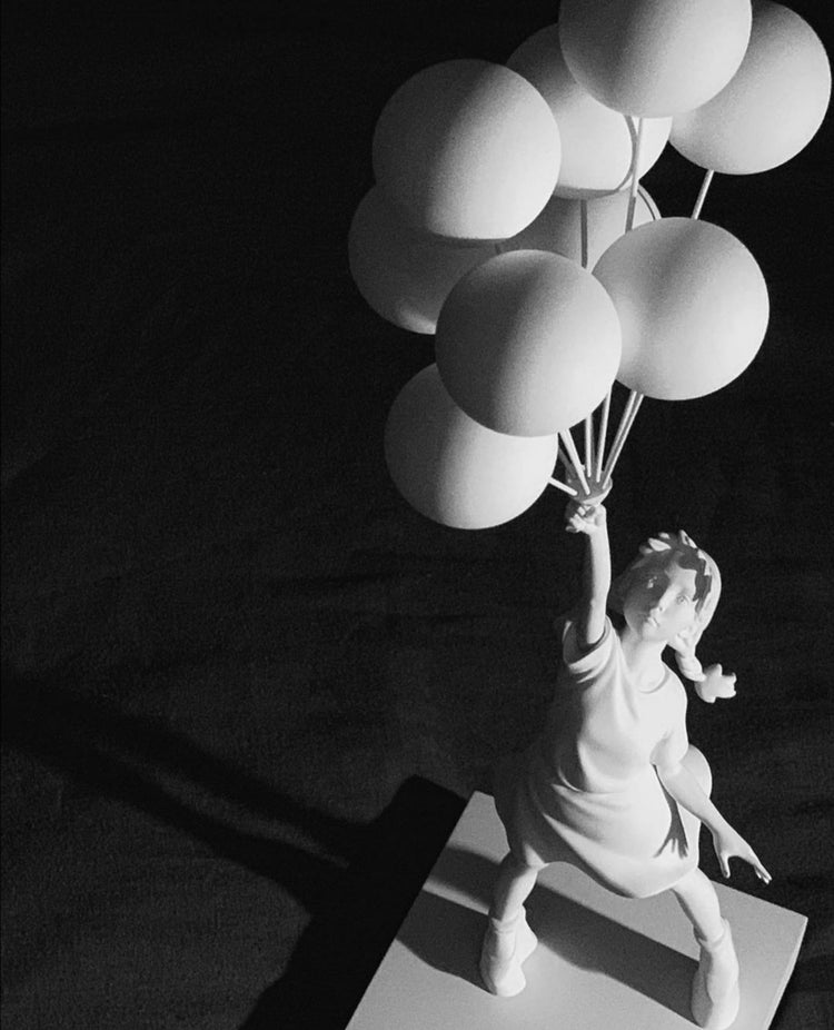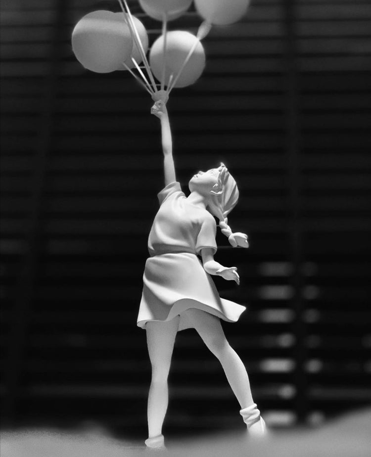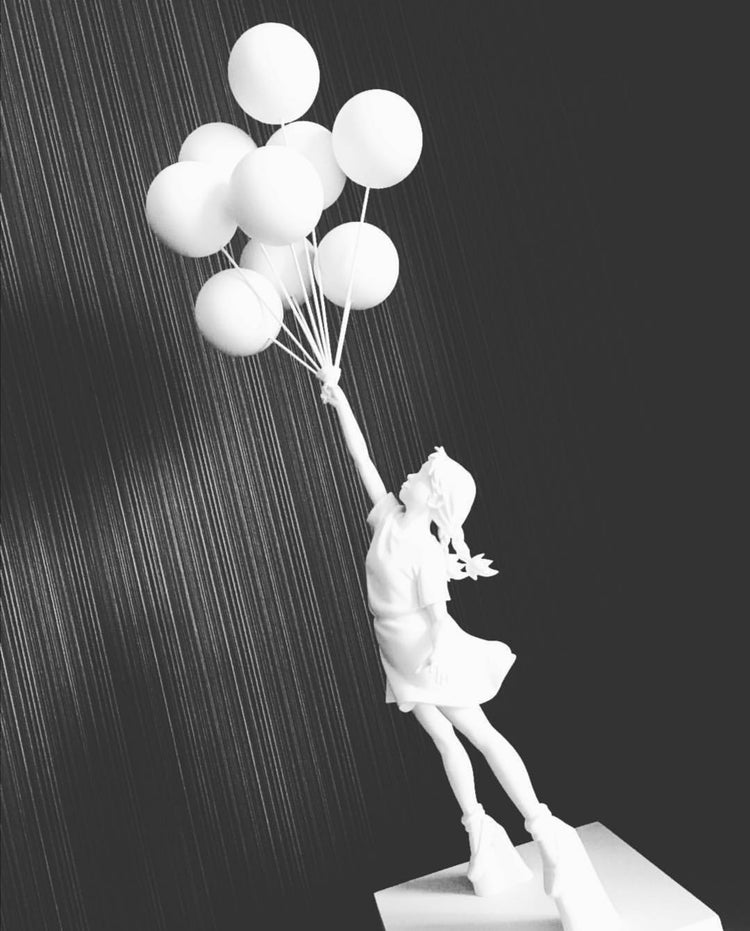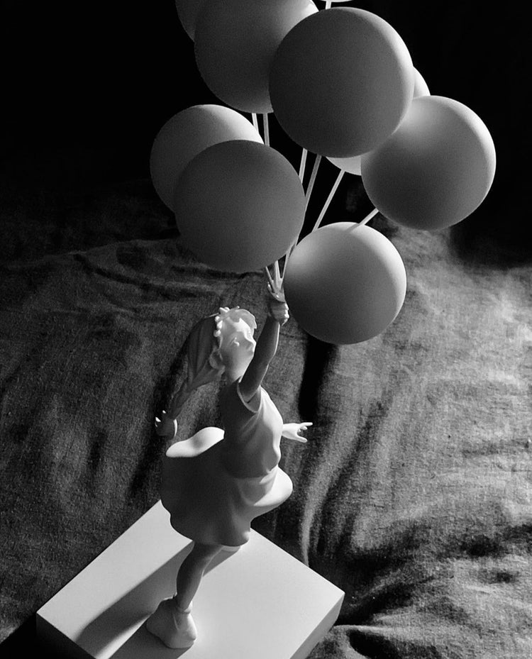 De kleurcontrasten tussen de balonnen en het meisje zijn opvallend en geven het beeld extra dimensie. Dit unieke kunstwerk zal zeker indruk maken op iedereen die het ziet. Het is een geweldige aanwinst voor elk interieur en zal zeker bijdragen aan een vrolijke en speelse sfeer in de ruimte. Laat je betoveren door de charme en schoonheid van dit prachtige beeld.
