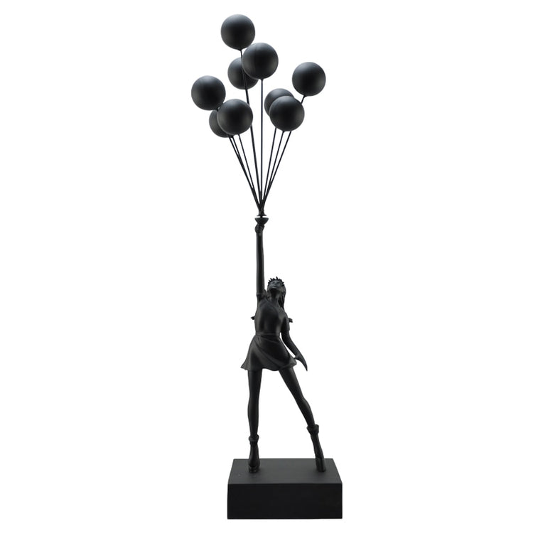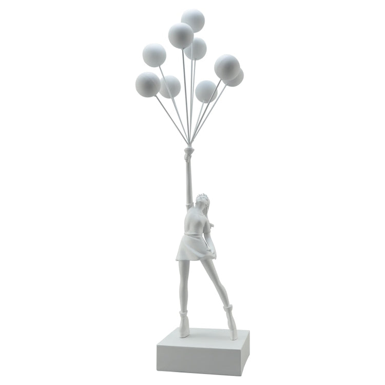 Dit prachtige sculptuur van een jonge meid in een jurk die omhoog wordt getrokken door een verzameling van balonnen is gemaakt van duurzame hars. Het beeld is handgemaakt en heeft prachtige details, waardoor het een echte eyecatcher is.