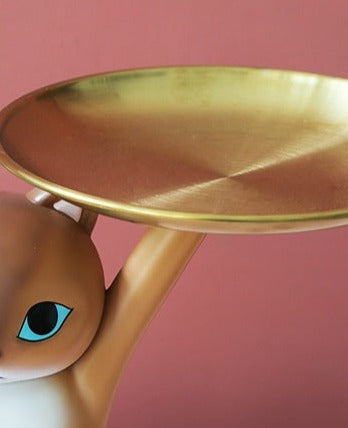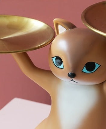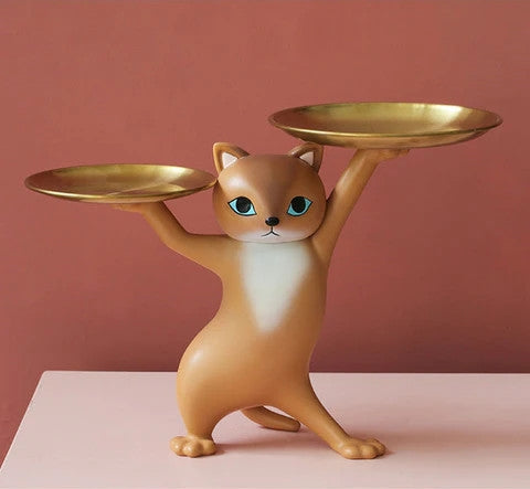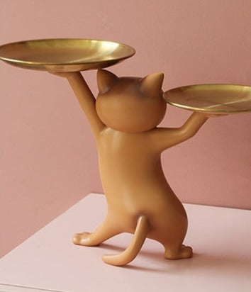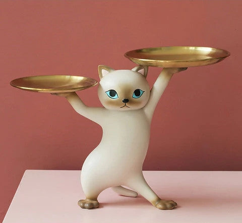 Kitty de Kat is ontworpen om sierlijk en functioneel tegelijk te zijn. Met een nonchalante sierlijke pose worden twee dienbladen hoog gehouden. De dienbladen met respectievelijke breedtes van 14cm en 17cm zijn groot genoeg om spullen zoals sleutels en accessoires te bedienen.